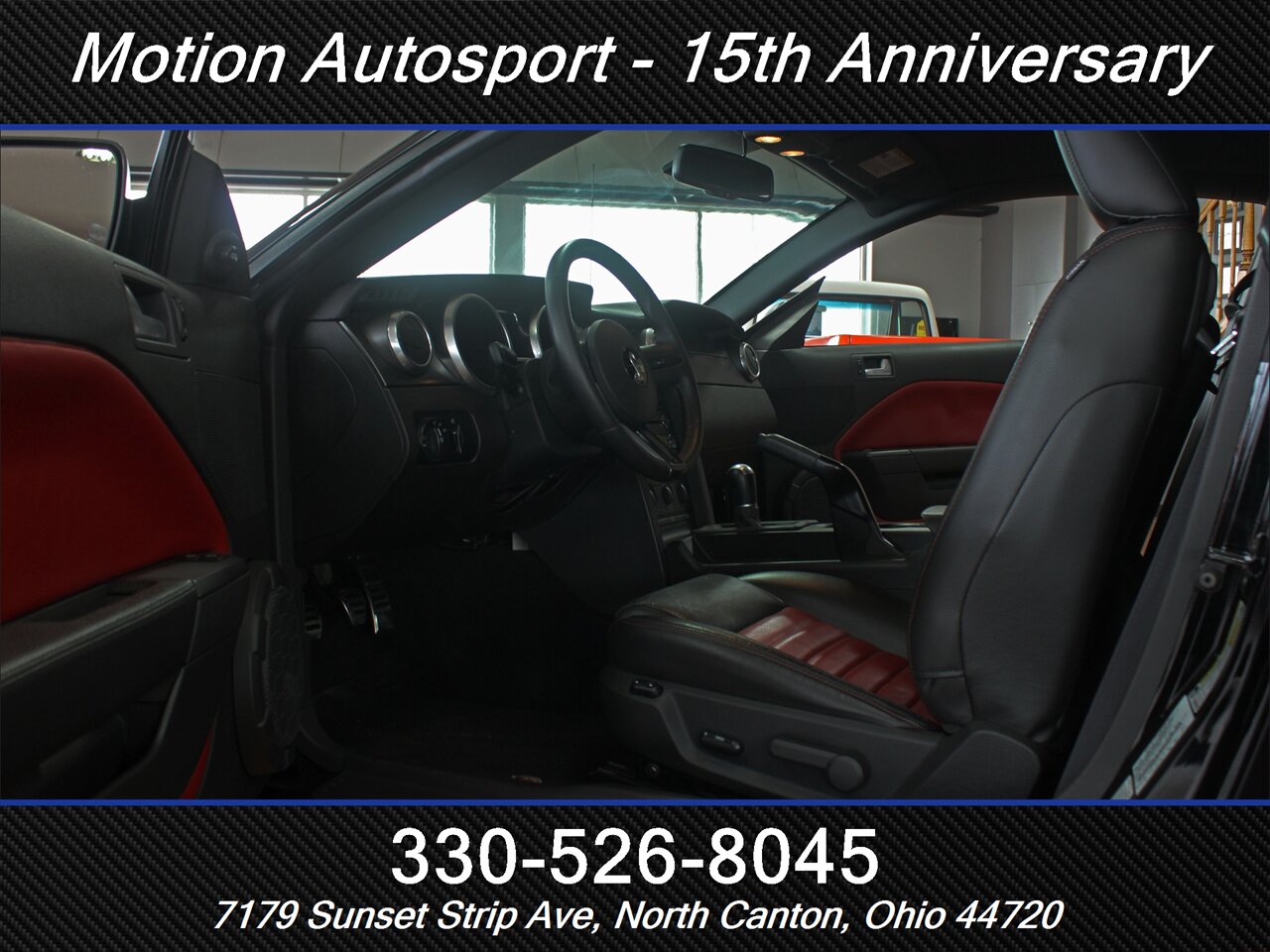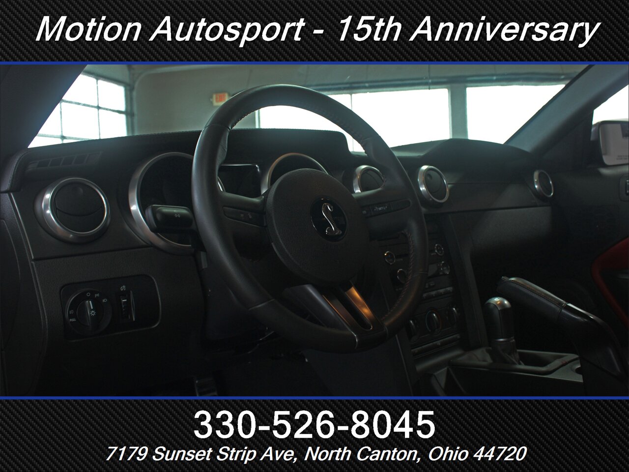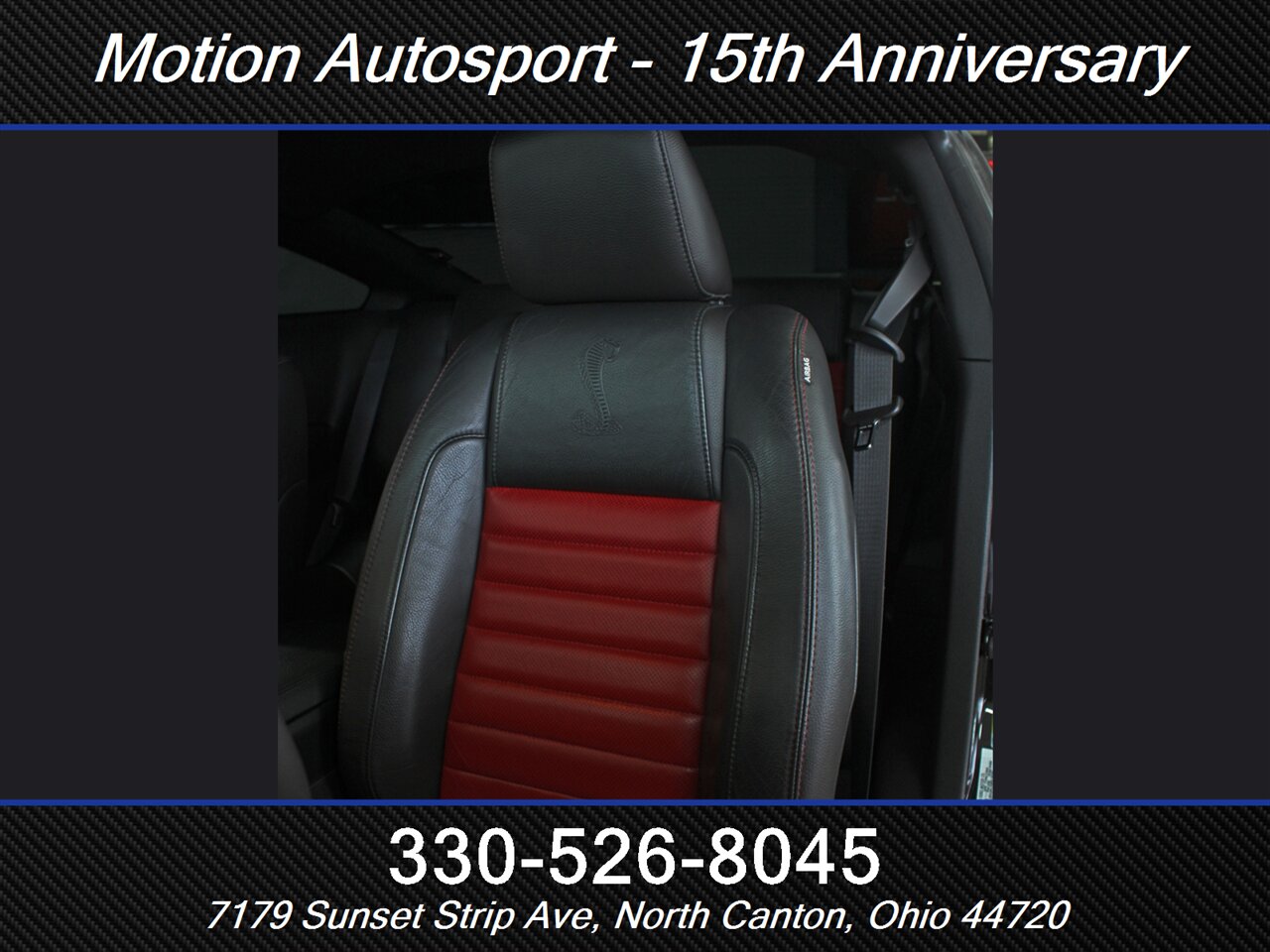 - Interior & comfort: Two-tone Charcoal Black/Crimson Red leather-trimmed sport seats with bolstered support, Shelby-branded accents and stitching, leather-wrapped steering wheel, power-adjustable front seats, and modern driver controls laid out for quick work on the street or strip.