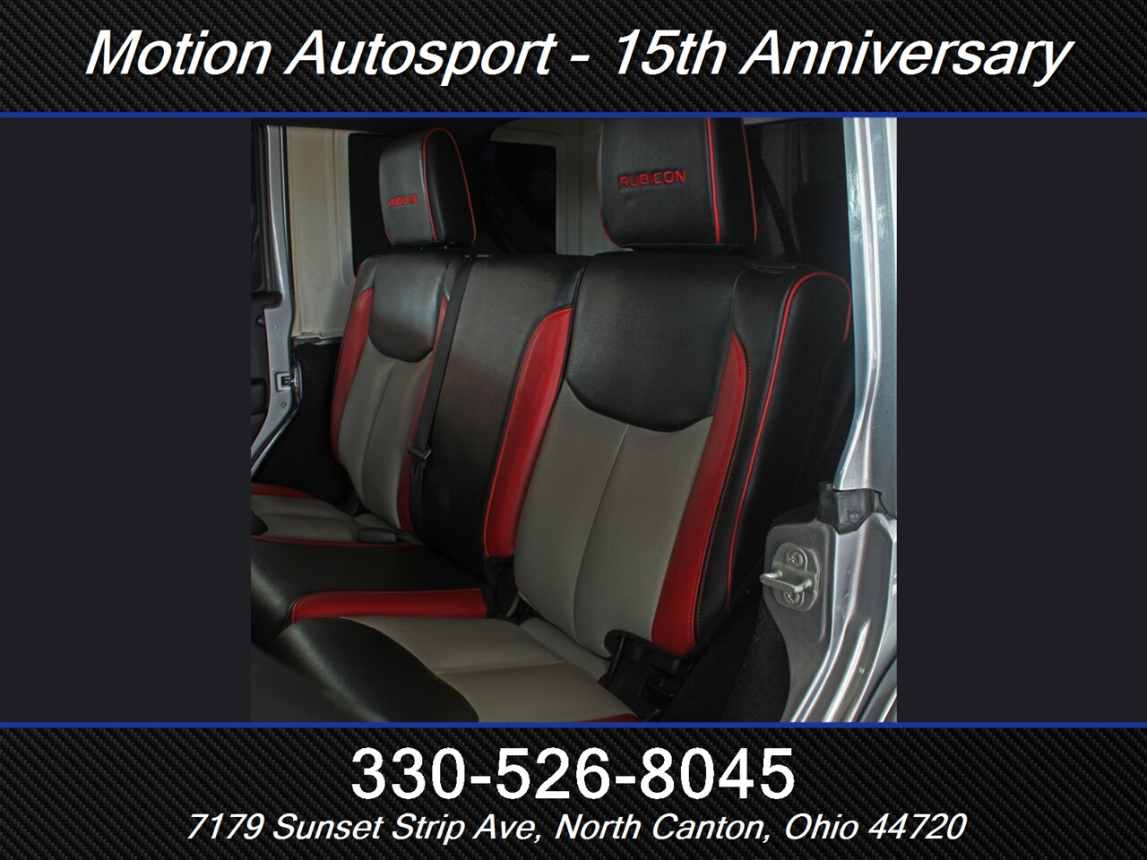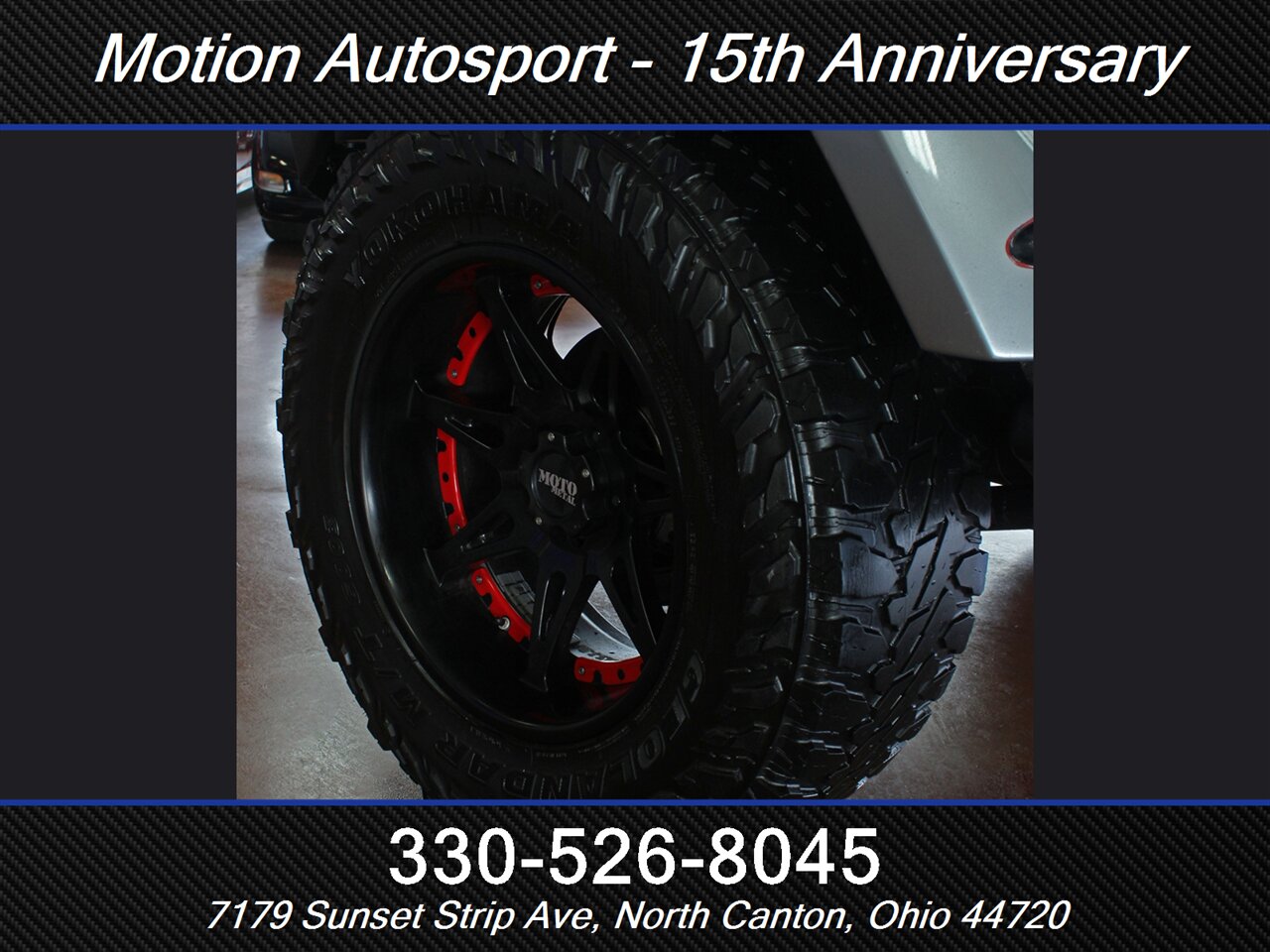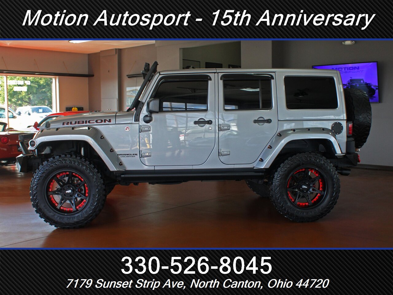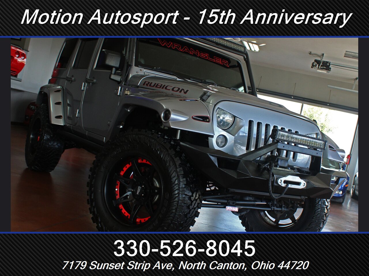 Motion Autosport is proud to present this absolutely stunning, one of a kind custom Rubicon Unlimited! Rare Billet silver over black leather with factory painted to match hard top and over 17 grand in extras that will knock your socks off! Highlights include a full 6 inch Skyjacker lift kit, custom wheels on 35s(all five), rock slider off road rockers, off road bumpers front and rear, winch, painted to match pocket flare extensions, off road lights, front and rear lockers, fresh service and detail and more! Very clean! No rust! One of a kind! YOU CANNOT DUPLICATE THIS JEEP FOR ANYWHERE NEAR OUR ASKING PRICE! Ask us about our spectacular financing and extended service contracts. We take trades and ship vehicles nationwide. Visit www.motionautosport.com for 60 detailed photos.