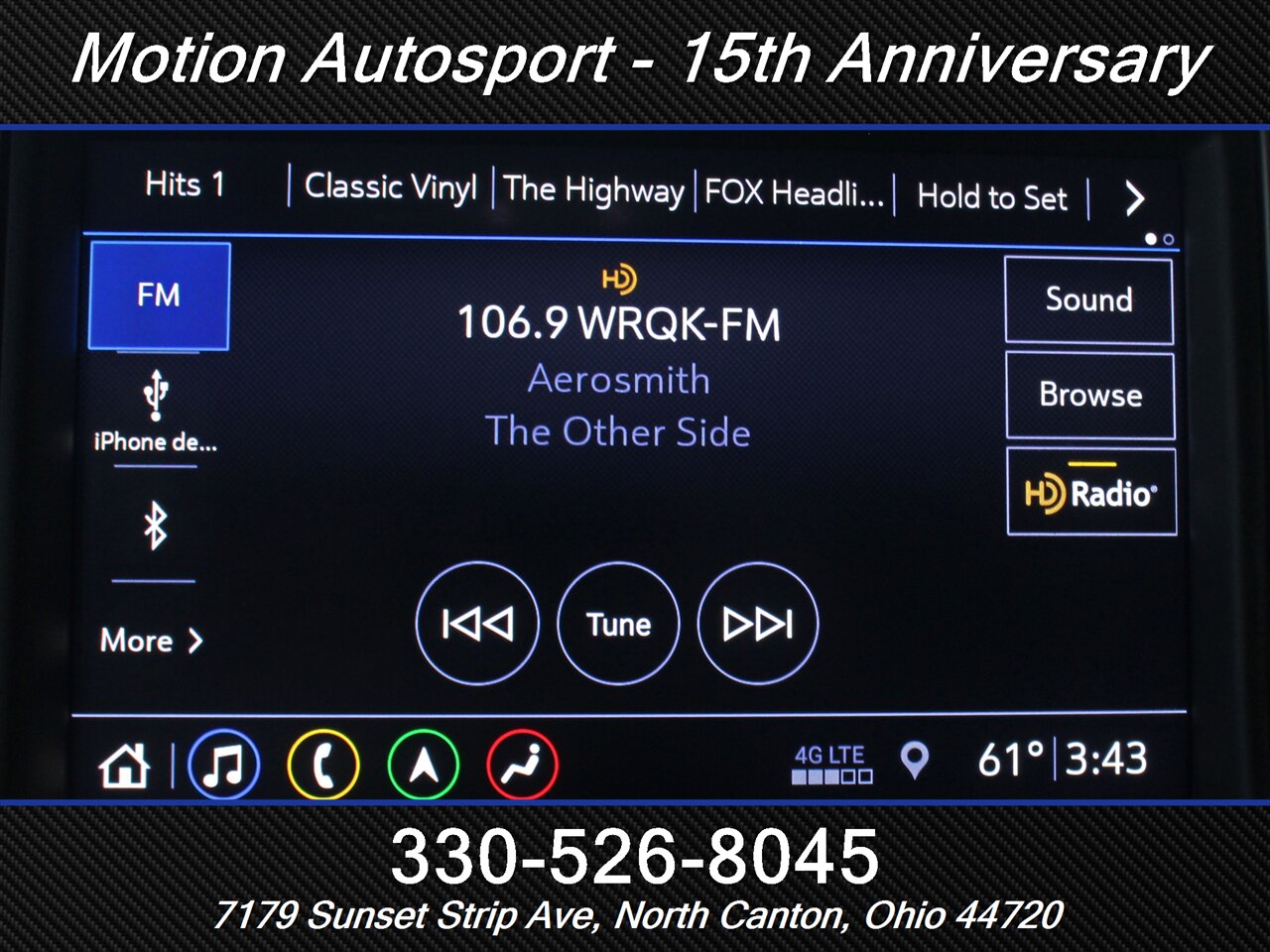 - Radio: AM/FM, HD radio, touch screen display, voice operated